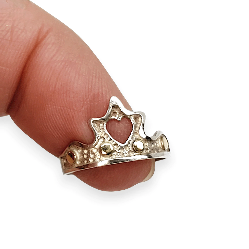 Hermoso anillo con diseño de Corona, elaborado en la elegante combinación de Plata y Oro. La pieza central presenta un delicado corazón calado y pequeños detalles en oro que realzan el brillo del diseño. Es el regalo ideal para celebrar a una persona especial, simbolizando realeza y afecto. Este anillo de ByMariana Joyas es un accesorio lleno de significado y calidad.